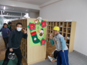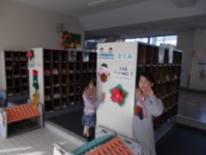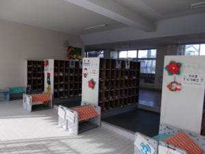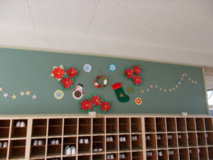 | 日頃から校内の花壇の花を世話してくださっている花ボランティアさんが、昇降口に手作りのクリスマス飾りを掲示してくださいました。校内が一気にクリスマスの雰囲気に。児童たちも「だれが作ったの?」「この飾り、どうやって作るの?」と興味津々。これから児童たちにとっては楽しいことが続く時期。大いに気分が盛り上がったようです。 |