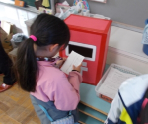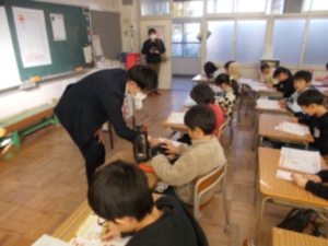 あらかじめいただいていた準備シートに、年賀状の表書き、裏書の下書きがしてありましたので、本番の年賀はがきにとてもスムーズに清書することができました。宛名の準備は保護者の方のご協力をいただきました。 完成した年賀はがきを、模擬ポストに投函し、受け取った人の笑顔を思い浮かべました。児童たちが書いた手書きの年賀状はどれも心がこもった、とても素敵なものでした。 |