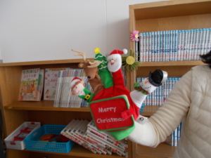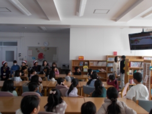 | 12月18日(木)の25分放課に、新しくなった図書室で図書ボランティアさんによる読み聞かせイベントがありました。たくさんの児童が詰めかけ、満席に。モニターを使って絵を見せながら、絵本の読み聞かせをしてくださいました。ボランティアさんたちはサンタの防止をかぶったり、クリスマスの指人形をつかったりして、クリスマス気分を盛り上げてくださいました。 |
