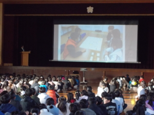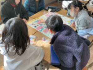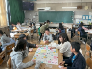 | 1月19日(月)の朝会でユネスコスクール正式加盟の件を伝えた際、「ユネスコスクールはSDGsの実現を目指す学校です」ということを話し、「目標10 人や国の不平等をなくそう」に関わって長久手市が策定を目指す「子ども条例」のことを取り上げました。そして先日長久手市の子ども政策課の職員と策定メンバーで本校の卒業生である中学生2人が本校を訪れ、児童に「子ども条例」に関心をもってもらうために「こどもの権利『なんでやねん!』すごろく」に取り組んでほしい、と依頼していったことを紹介しました。そして、5年生の児童会役員と学級委員がデモンストレーションで取り組んだすごろくの様子のビデオを流しました。あるコマに進んだら子ども目線での大人に対する不満を読み上げ、みんなで「なんでやねん!」とツッコミを入れます。それが面白かったらしく、児童たちは口々に「すごろく、やってみたい!」と言っていました。別のコマでは「子どもの権利条約」を読み上げるということもあり、低学年には少し難しいかもしれませんが、チャレンジできるとよいと思います。この日、さっそく1クラスが取り組みました。みんなで遊びながら子どもの権利について学びました。 |