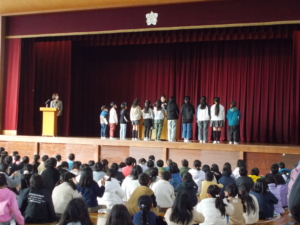| 2月2日(月)の朝会では、読書感想画コンクールの表彰伝達を行いました。校長講話では、「1月は行く、2月は逃げる、3月は去る」と言われるように、年が明けるとさまざまな行事が続き、準備・本番・まとめをしていると、あっという間に日々が過ぎていくように感じる。でも一つ一つのことに丁寧に向き合っていこう、という話をしました。特に6年生は卒業まで残りわずか。クラスでは卒業までのカウントダウンカレンダーを作ったりして、毎日を大切に過ごそうとしているようです。1~5年生も今年度のまとめと来年度に向けた準備に、心を落ち着けて取り組んでほしいと思います。 |