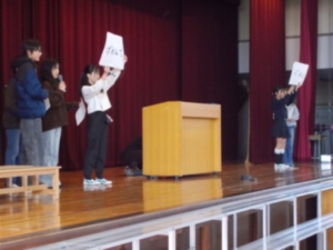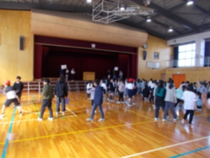 | 3月4日(水)の25分放課、児童会主催のレクリエーションがありました。内容は「曲あてクイズ」。曲を短い時間で流した後、児童会役員が示す2つの候補のうちどちらが正解かを当てる、というものです。舞台上で候補が表示されると児童は正解だと思う方にまっしぐら。正解が発表され、曲がしばらく流れると、曲に合わせて踊りだす児童がたくさんいました。多くの参加者があり、大盛況でした。今年度の児童会企画は今回が最後。児童会長の「半年間、ありがとうございました!」という言葉で締めくくられました。 |