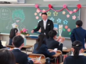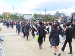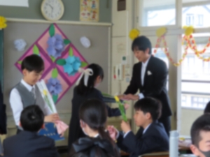 | 3月19日(木)、卒業証書授与式がありました。小学校最後の日。6年生たちはさまざまな表情を見せていました。式場への入場では引き締まったきりりとした表情、証書授与では少し緊張した面持ち、別れの言葉では、これまでの6年間を思い返したり気持ちを伝えたりする中で感情があふれ出ている様子でした。転じて式後の学活では大盛り上がり。緊張からの解放もあって、仲間や担任との最後の時間をにぎやかに過ごしました。歓送の場面では、まっすぐに前を向いて、新たに始まる生活への期待が感じられるようでした。