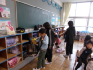 「ロッカーの中にはこうやってランドセルを入れるんだよ」 |