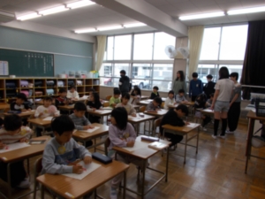 | 始業式の翌日から、朝6年生たちが当番制で1年生の教室を訪れ、カバンの片付けなどを手伝っています。長久手小学校では毎年こうした取組が行われ、今の6年生たちも自分が1年生のときに6年生のお兄さん・お姉さんたちが来てくれたことを覚えていて、意気に感じて1年生の世話をしているようです。優しく声をかける6年生の姿に頼もしさを感じます。